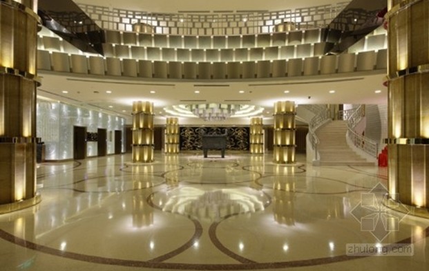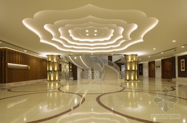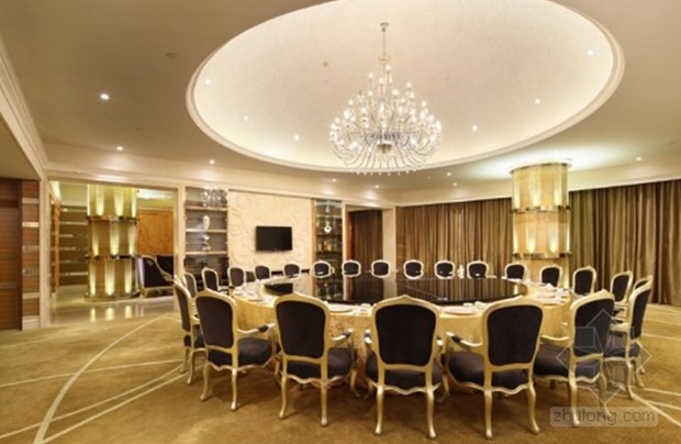 設(shè)計(jì)師摒棄了傳統(tǒng)高檔餐廳的金碧輝煌,在大廳的設(shè)計(jì)中將“牡丹”、“祥云”、“浮萍”、“瓦片”等元素運(yùn)用其中,寄托了對東方文化的無限情感!澳档ぁ敝饕憩F(xiàn)在頂面造型之中,在恢弘的空間中增添了優(yōu)雅的氣質(zhì),烘托清雅閑逸的情境。“祥云”躍然于畫面之上,散發(fā)著無限曼妙的意境,富有煙云溟?的意趣,配合地面水波蕩漾的圖案,蜿蜓又悠然自得的神態(tài)表現(xiàn)的淋淋盡致,豐富了視覺效果,讓人不禁幻想是徜徉在一望無際的大海之中。中庭的設(shè)計(jì)將柱子與梁的結(jié)構(gòu)大膽的運(yùn)用和處理,使空間多了份莊嚴(yán)與質(zhì)樸。傳統(tǒng)房屋中“瓦片”元素的運(yùn)用更加貼近自然。