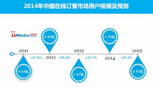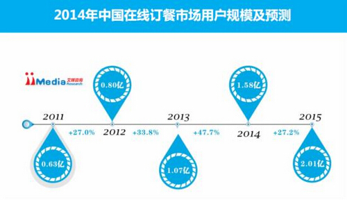 iiMedia Research數(shù)據(jù)顯示,2013年中國在線訂餐市場用戶規(guī)模達(dá)到1.07億,預(yù)計2014年中國在線訂餐用戶規(guī)模將達(dá)到1.58億。