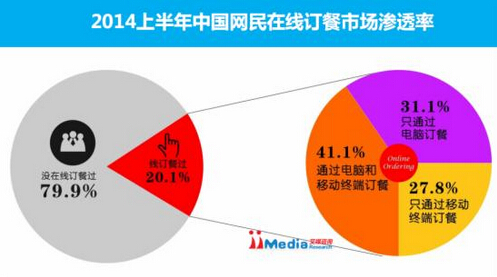 iiMedia Research數(shù)據(jù)顯示,2014年上半年中國網(wǎng)民在線訂餐滲透率達(dá)到20.1%。在訂餐網(wǎng)民中,有27.8%只通過手機(jī)、平板等移動終端進(jìn)行訂餐,只通過電腦訂餐的占31.1%。