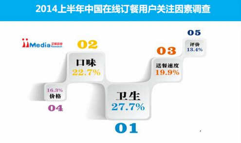 iiMedia Research數(shù)據(jù)顯示,2014年上半年中國在線訂餐用戶關(guān)注因素方面,食物衛(wèi)生、口味、送餐速度最受用戶關(guān)注,占比分別為27.7%、22.7%、19.9%。iiMedia Research分析認(rèn)為,在線訂餐用戶需求比傳統(tǒng)餐飲消費(fèi)更復(fù)雜和碎片化。