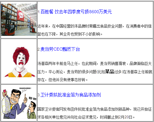[摘要] 百勝集團(tuán)公布第四季度財(cái)報虧損巨大,麥當(dāng)勞CEO黯然下臺。春節(jié)近了,衛(wèi)計(jì)委擬批準(zhǔn)金箔為食品添加劑,因?yàn)闊嶙h。